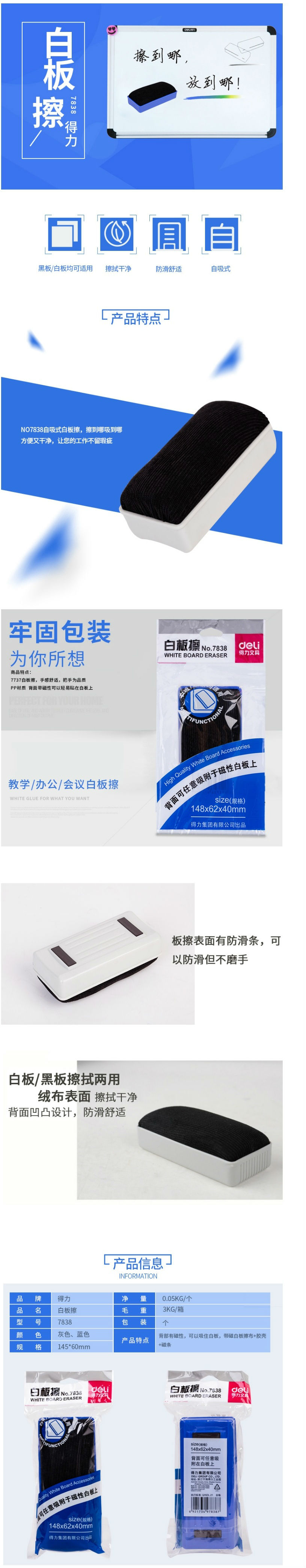商品名称:得力7838白板擦148*65*40(混)(只)