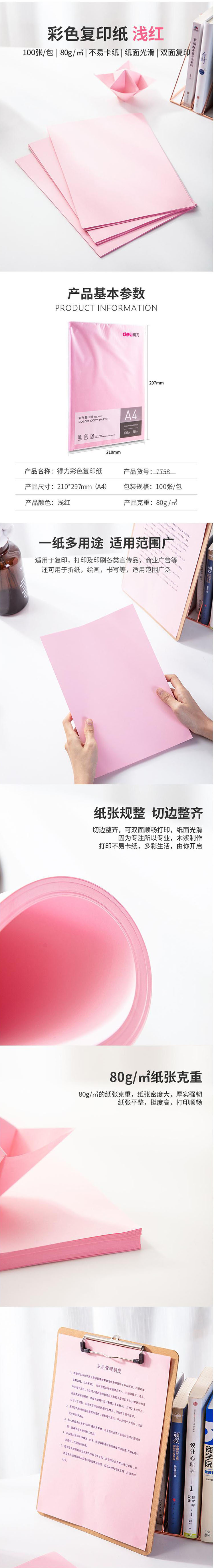 商品名称:得力(deli) A4彩色复印纸 打印纸 折纸 彩纸 80G 100张/包 7757粉红色