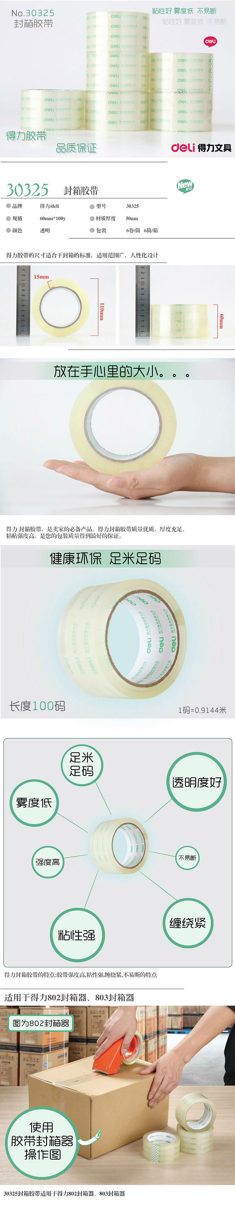 商品名称:得力(deli) 高透明封箱胶带打包胶带 60mm*100y*50um(91.4m/卷) 30325(6卷/筒)