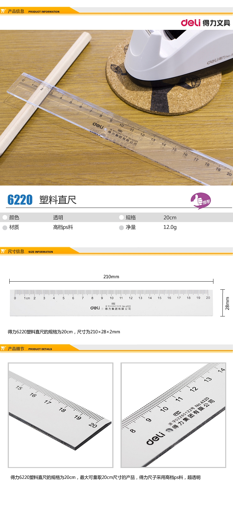 商品名称:得力(deli)办公通用直尺20cm 测量绘图尺子 6220