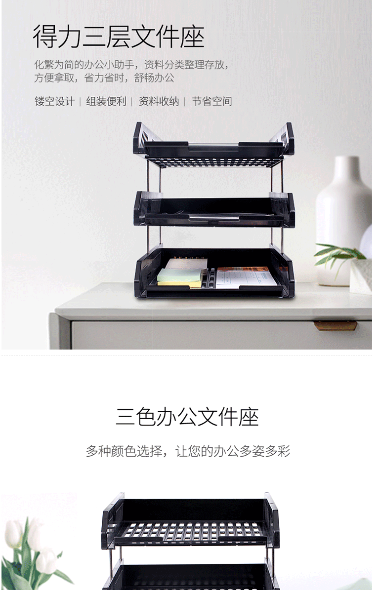 得力(deli)三层镂空收纳文件座 自由拆卸组装三层文件盘 9209黑色