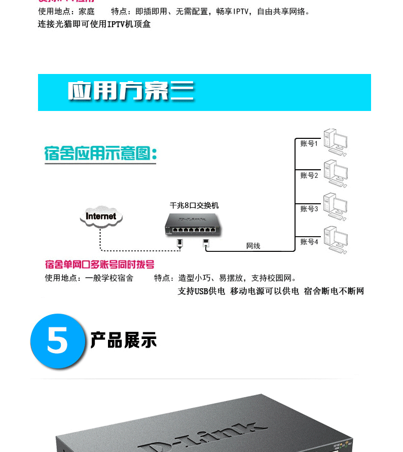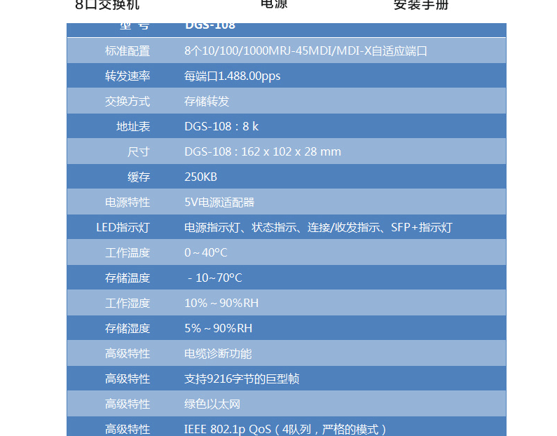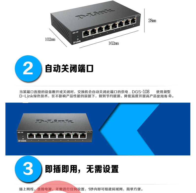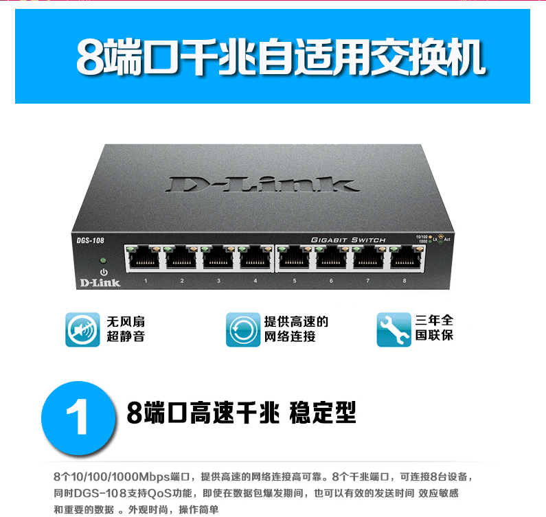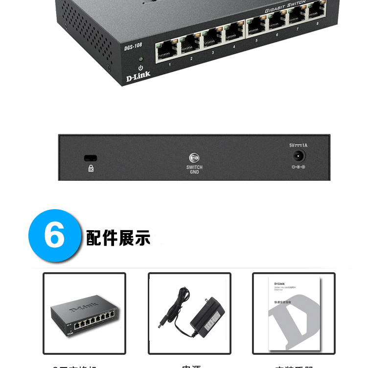 商品名称:友讯(D-Link)DGS-108 8口全千兆铁壳桌面型可壁挂非网管以太网交换机网络监控分线器