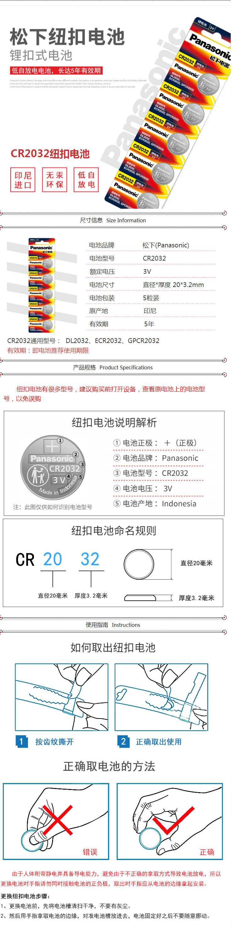 商品名称:松下(Panasonic)CR2032纽扣电池3V 五粒/卡