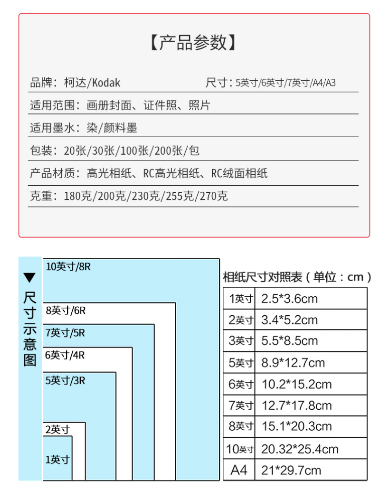 商品名称:美国柯达Kodak A4-200g高光面照片纸/喷墨打印相片纸/相纸 20张/包 5740-333