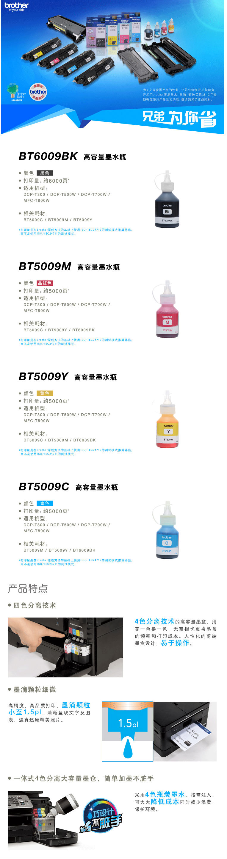 商品名称:兄弟原装BT5009Y黄色墨水(适用于T300/T500W/T700W/T800W/T900W打印机)