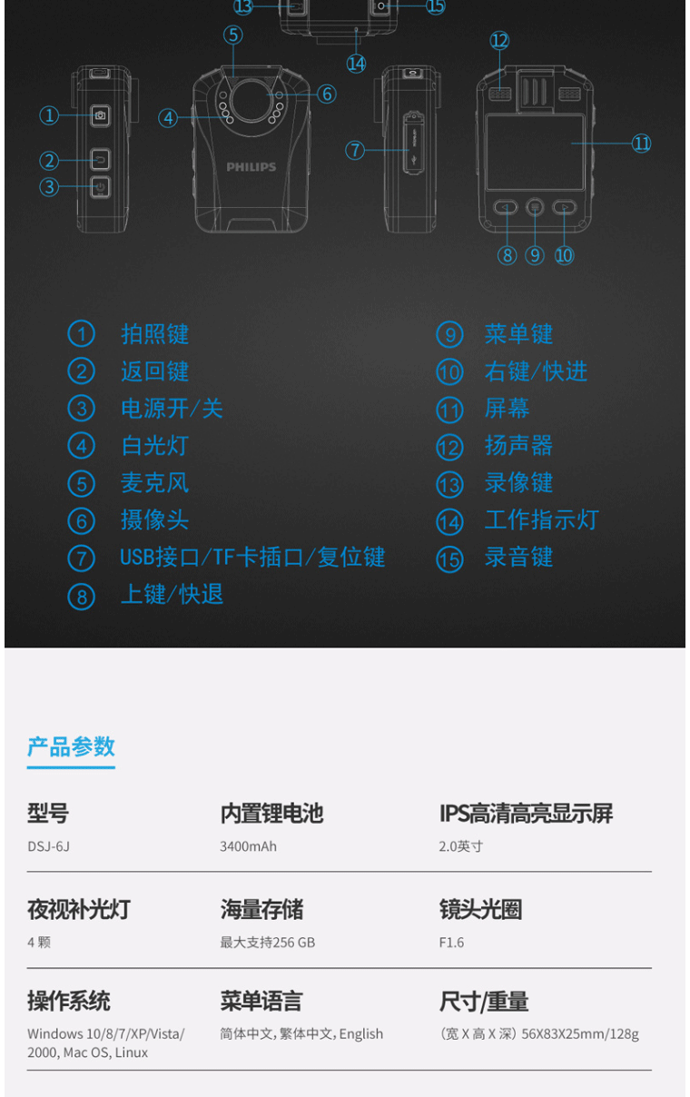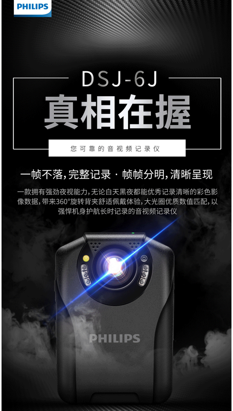 商品名称:飞利浦(PHILIPS)DSJ-6J 执法记录仪 高清红外夜视随身便携音视频记录仪现场执法仪 64G
