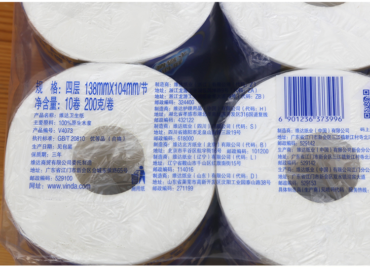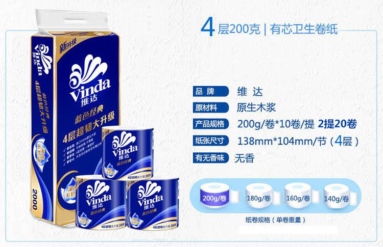 商品名称:维达(Vinda) 卷纸 蓝色经典4层200g卫生纸巾*10卷 4073 维达卫生纸 维达卷纸 维达蓝色经典