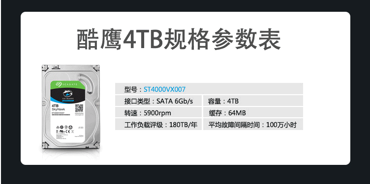 希捷(Seagate)监控硬盘4TB 64MB 5900转 SATA 希捷酷鹰ST4000VX007