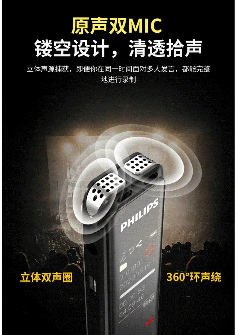 飞利浦(PHILIPS)VTR5103 16G AI智能录音笔 双麦克高品质录音 终身免费转文本/翻译
