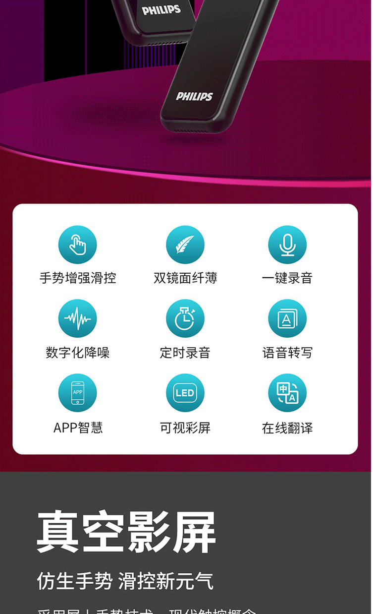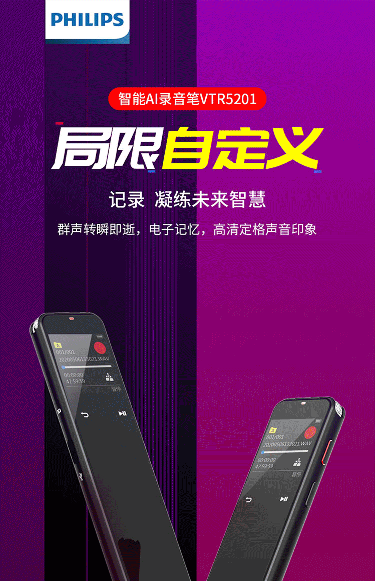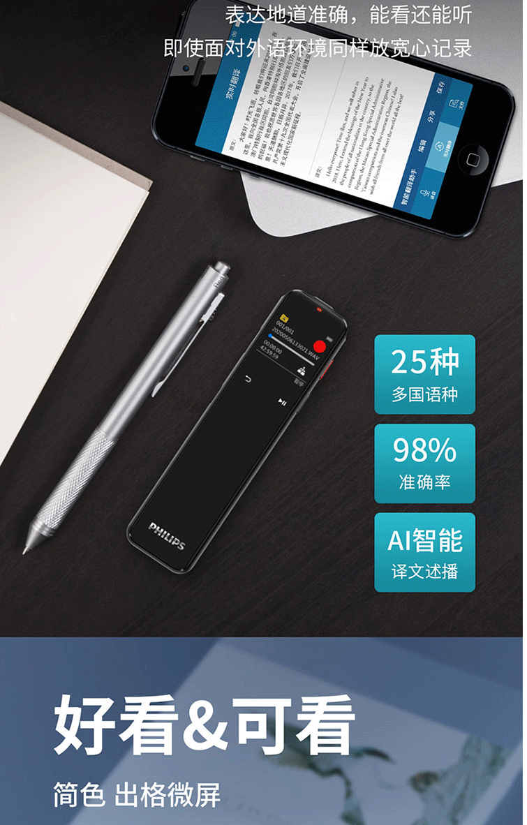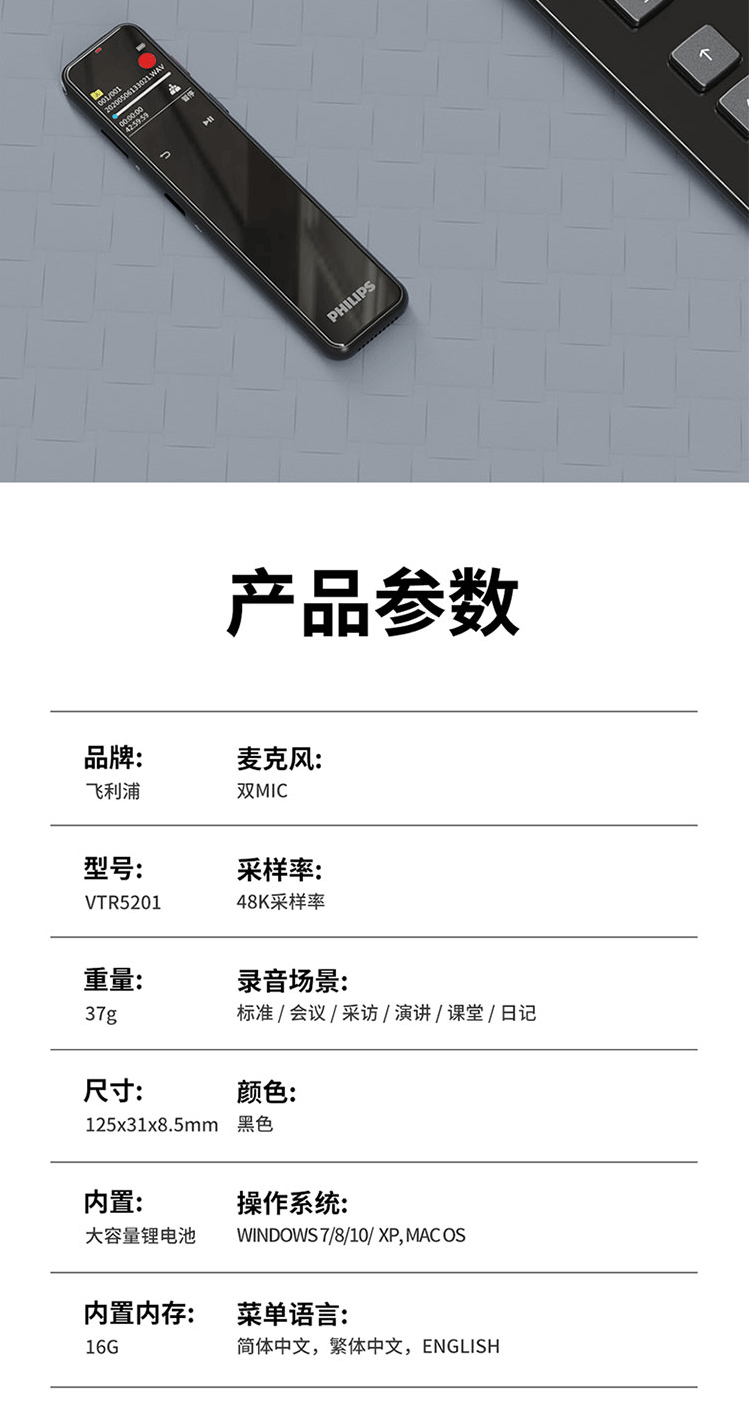 商品名称:飞利浦(PHILIPS)VTR5201录音笔 16G 采访会议课堂 高品质麦克风 终身免费转文本/翻译