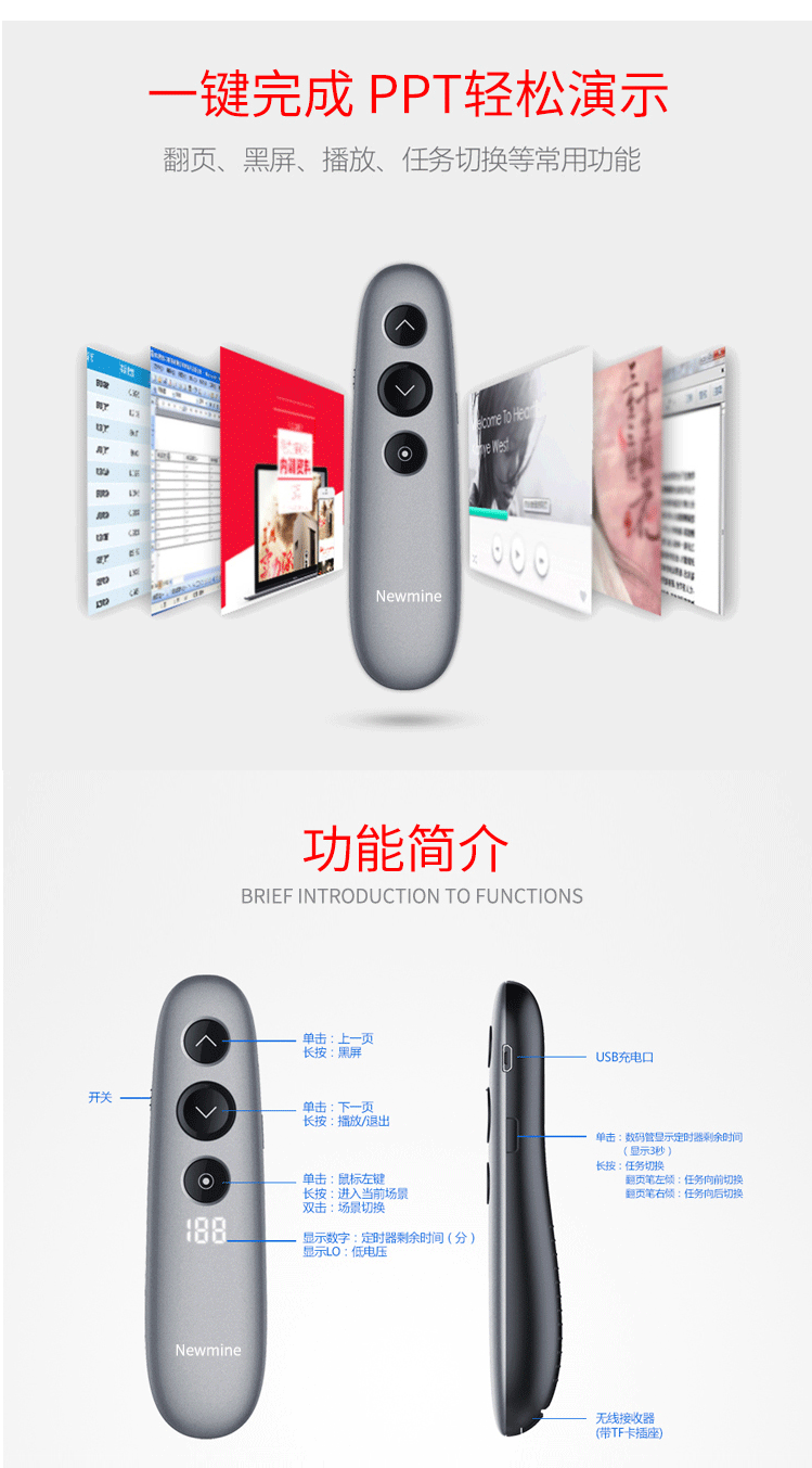 商品名称:纽曼(Newmine) J100 翻页激光笔 PPT演讲笔演示器 适合LED液晶屏幕布遥控笔
