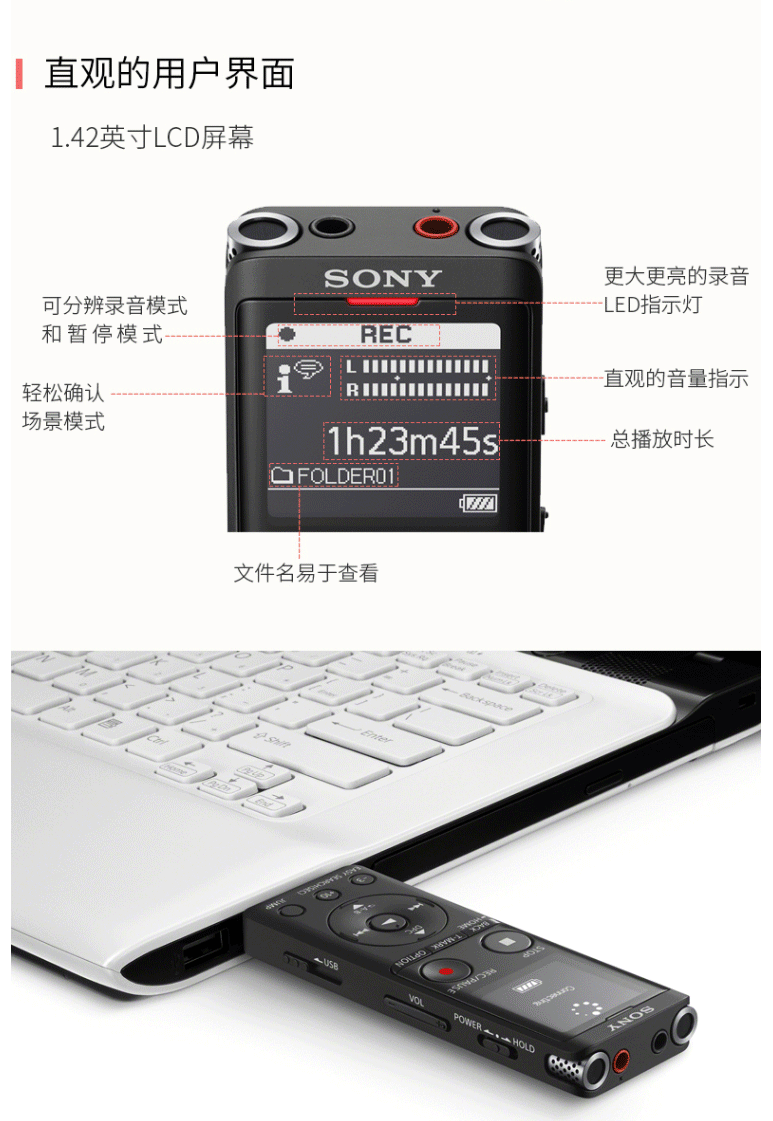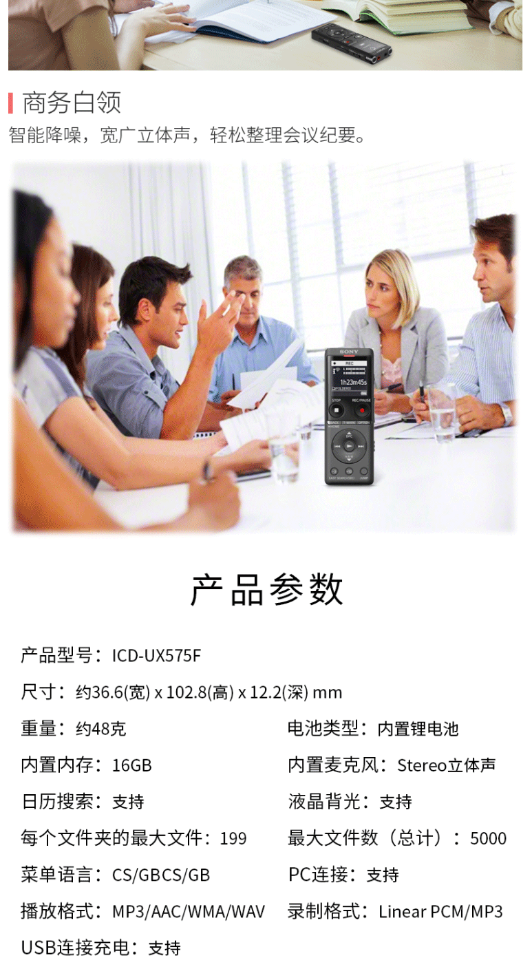 商品名称:索尼(SONY)录音笔ICD-UX575F 16GB 黑色 智能降噪升级款 专业线性录音棒