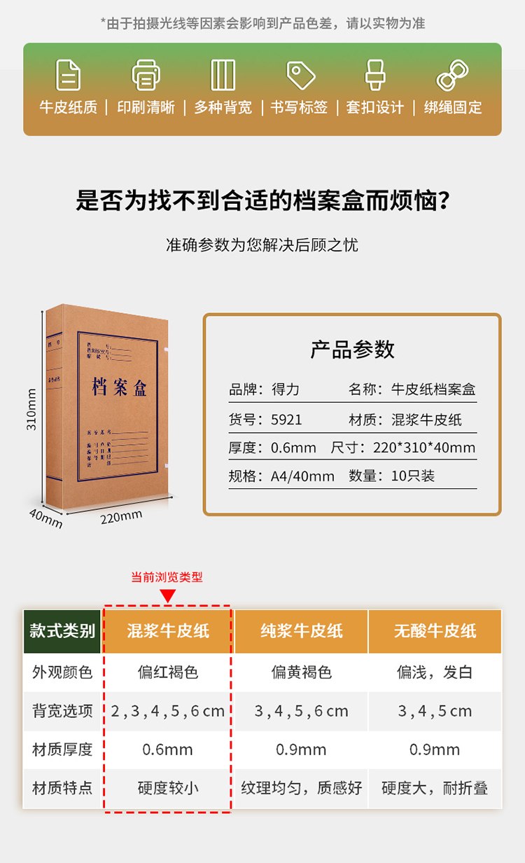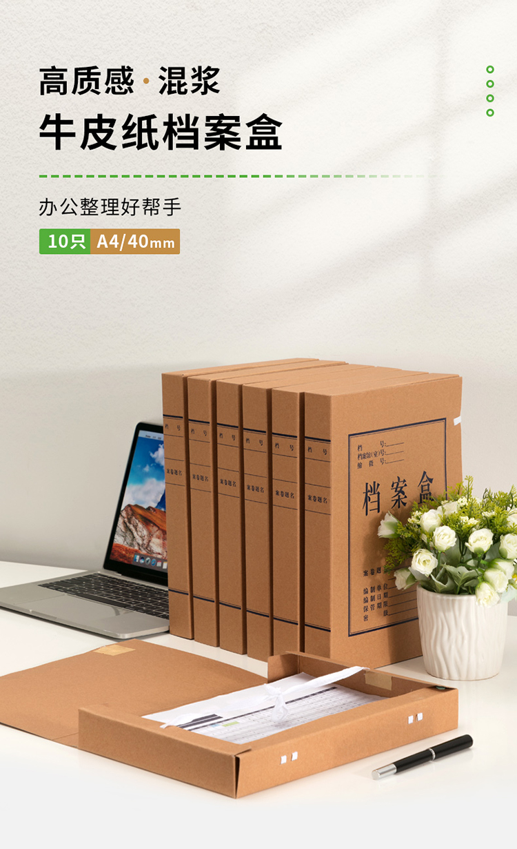商品名称:得力(deli)40mm高质感牛皮纸档案盒 党建资料盒 加厚文件收纳盒 财务凭证盒5921 (10只/组)