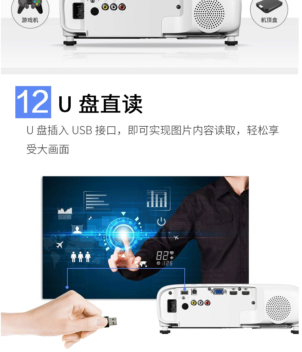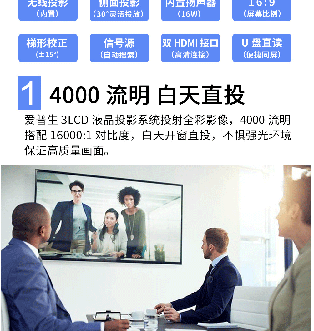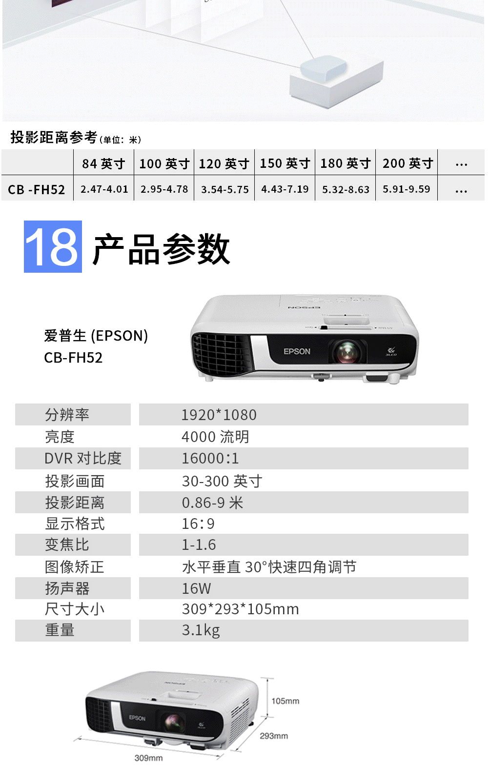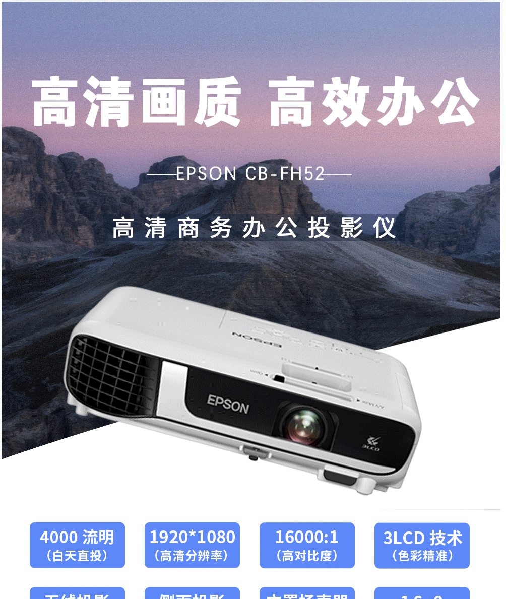 爱普生(EPSON)CB-FH52 投影仪 投影机(1080P全高清 4000流明 1.6倍变焦)投影