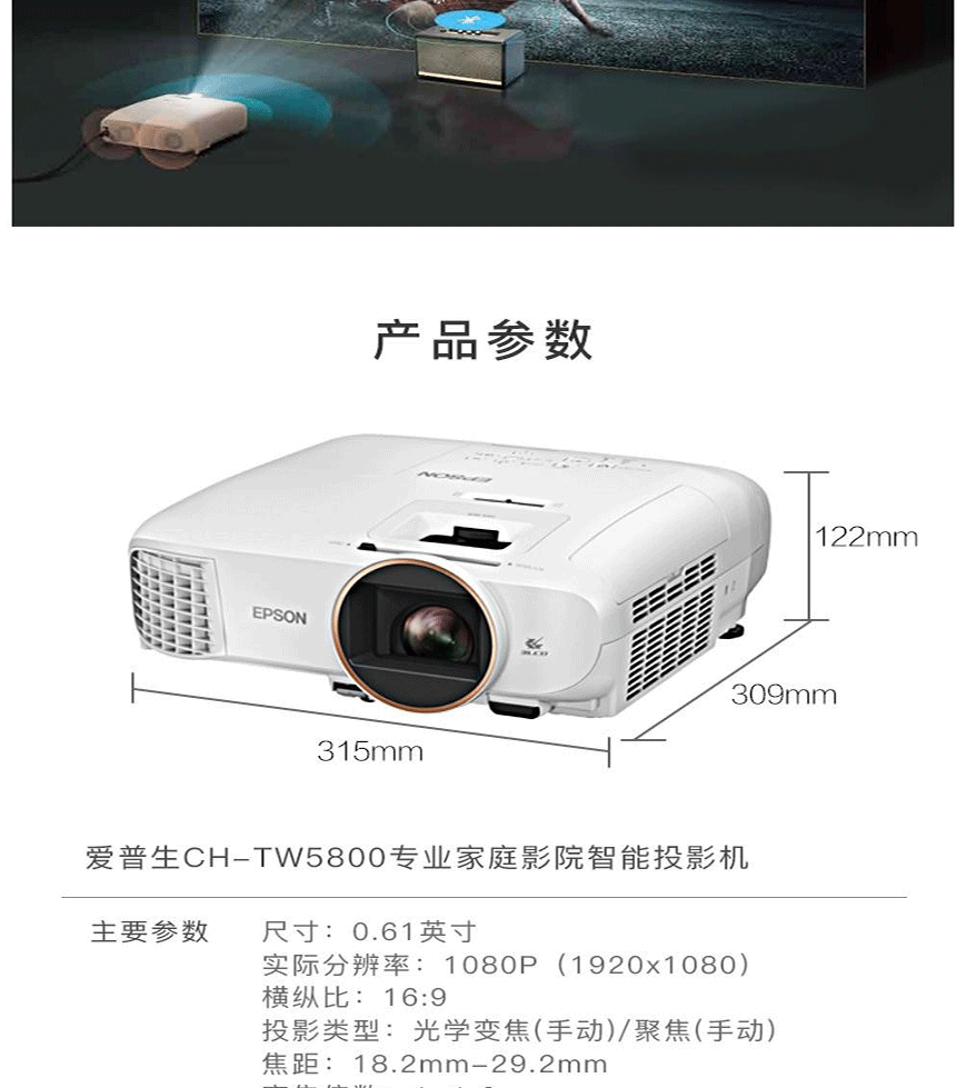 商品名称:爱普生(EPSON)CH-TW5800投影仪 全高清智能投影机 2700ANSI流明 投影机 投影