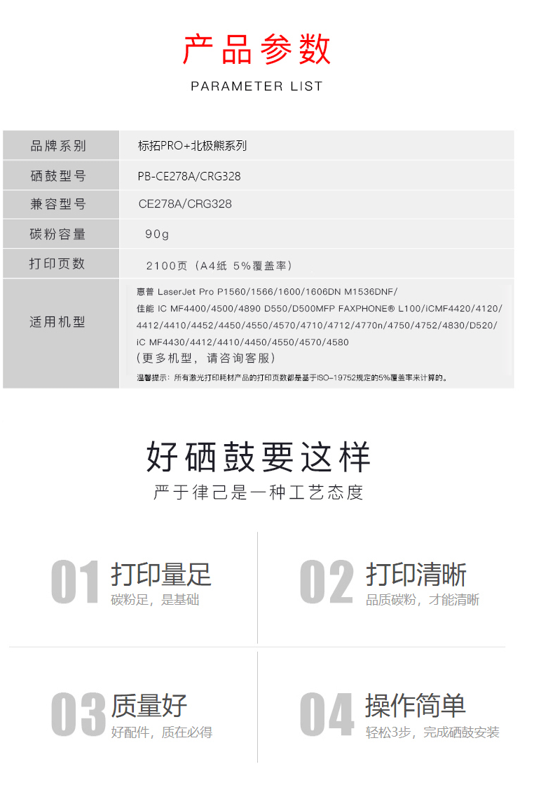 商品名称:标拓 (Biaotop) CE278A/CRG328易加粉硒鼓适用HP P1560/1566/1600/1606DN/M1536DNF打印机 北极熊版
