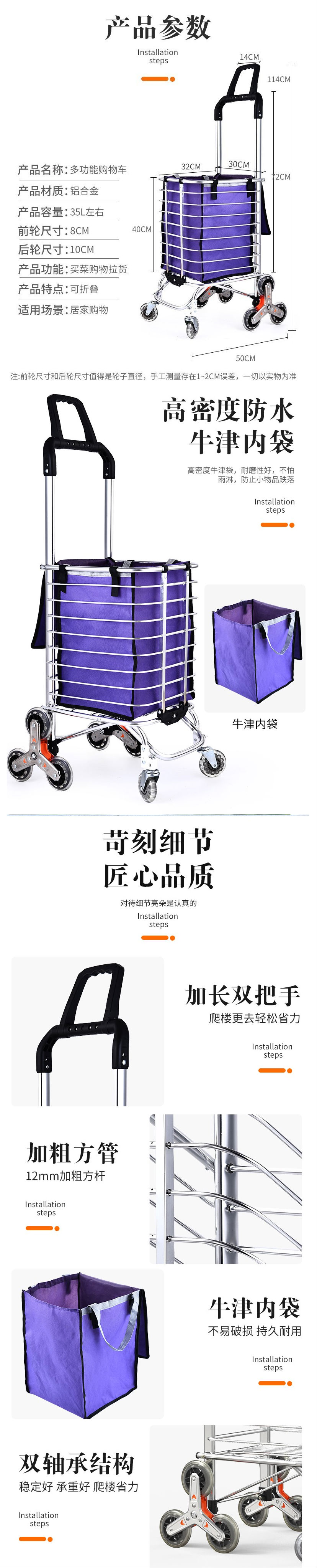 商品名称:亮朵 铝合金购物车 双把手八轮爬楼两用【紫色】