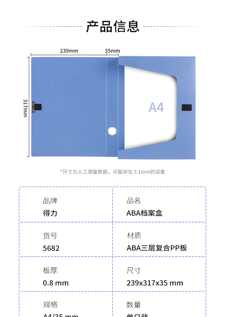 商品名称:得力(deli)加厚塑料档案盒 35mmA4文件盒 5682蓝色 1只