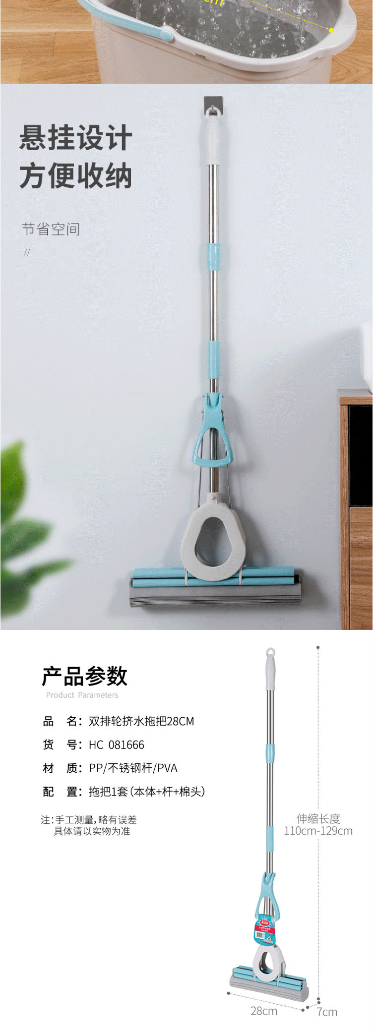 商品名称:美丽雅海绵拖把 双排滚轮免手洗胶棉拖把 28CM