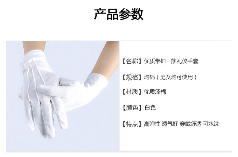 商品名称:三筋礼仪手套 涤纶带扣款 10副