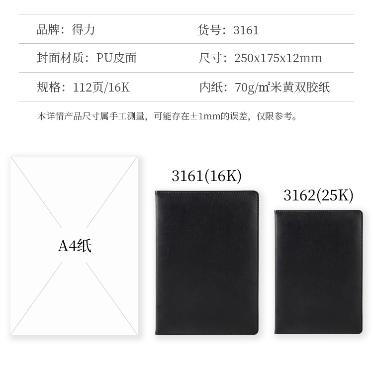 商品名称:得力(deli)16K112张大号商务皮面本 会议记事本笔记本品 3161黑色(单位:本)