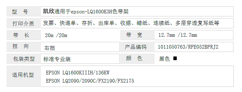 商品名称:凯欣KX-LQ1600KIIIH色带架(适用爱普生 EPSONFX2190/LQ2090/LQ1600KIIIH/136KW/FX2175 含色带芯)