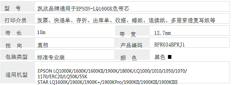 商品名称:凯欣KX-LQ1600KIIIH色带芯(适用爱普生EPSON LQ1600K3H 2680k 2090 FX2190)