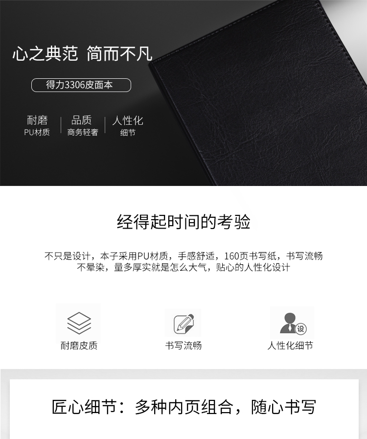 商品名称:得力(deli) A4/160张加大加厚商务皮面本 3306棕色 (单位:本)