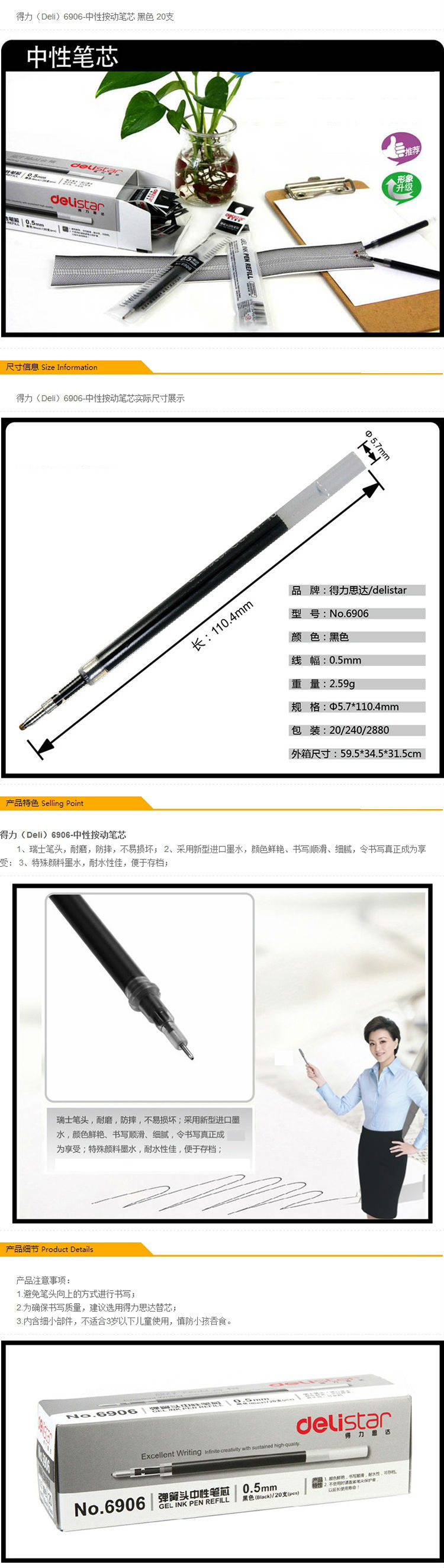 商品名称:得力(deli)0.5mm按动中性笔芯 水笔签字笔替芯6906黑色 20支/盒