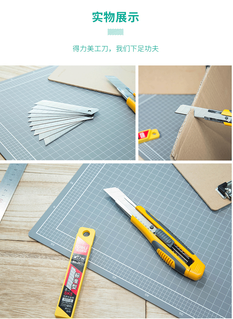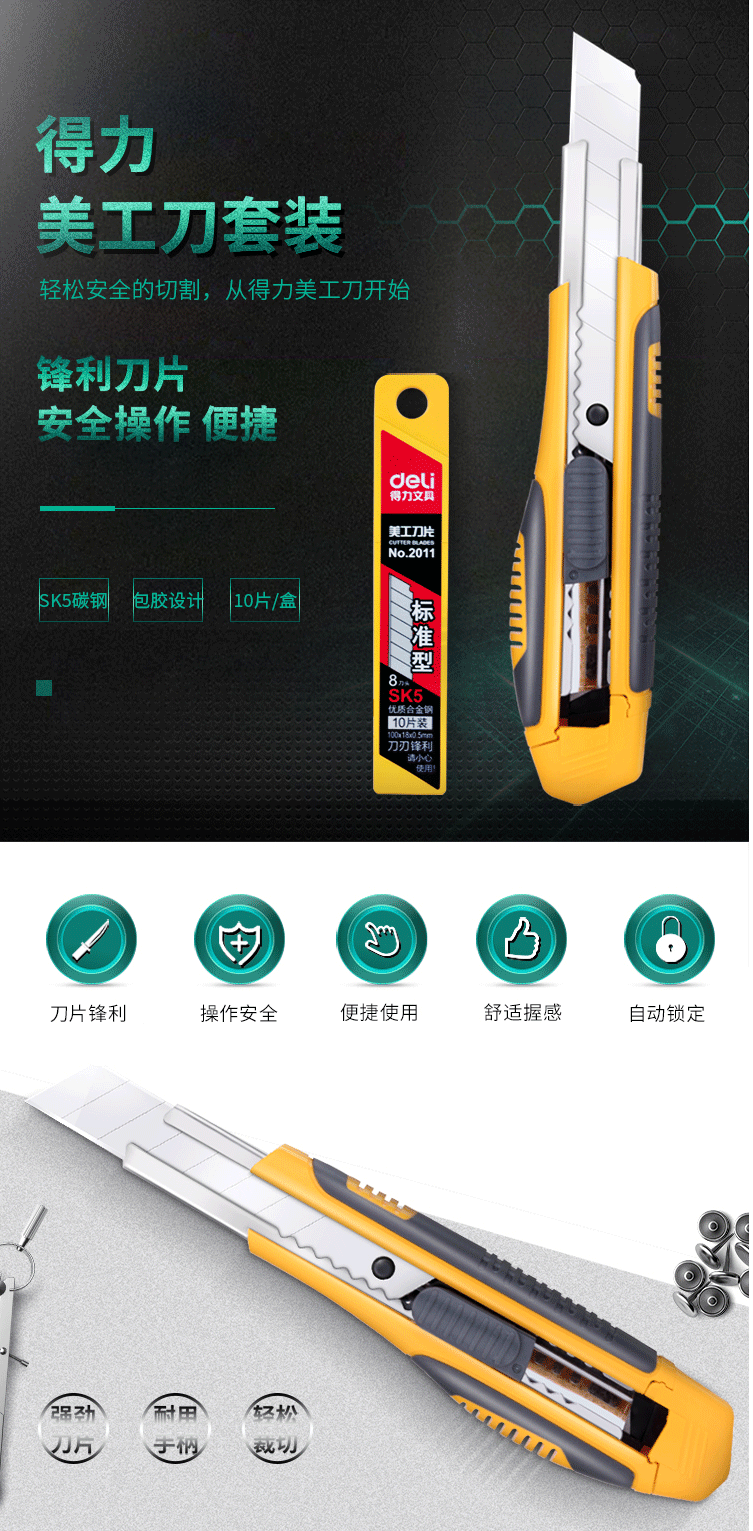 商品名称:得力(deli)大号耐用美工刀套装 自动锁定功能裁纸刀美工刀1把+10片美工刀片