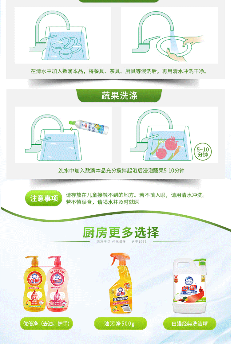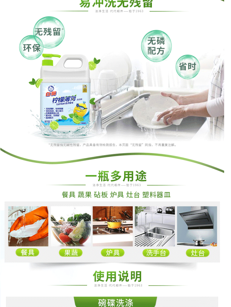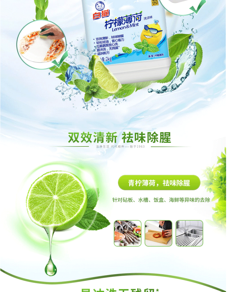 白猫 柠檬薄荷洗洁精2kg*8瓶(整箱装)