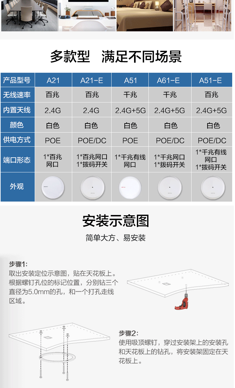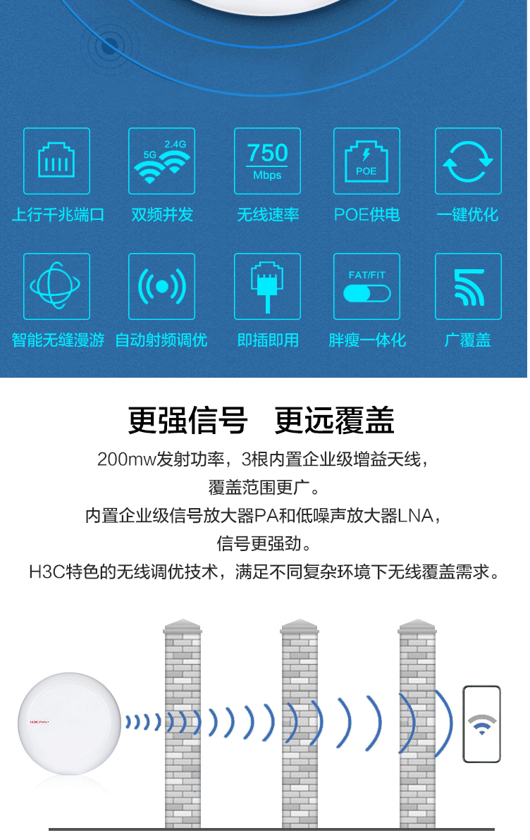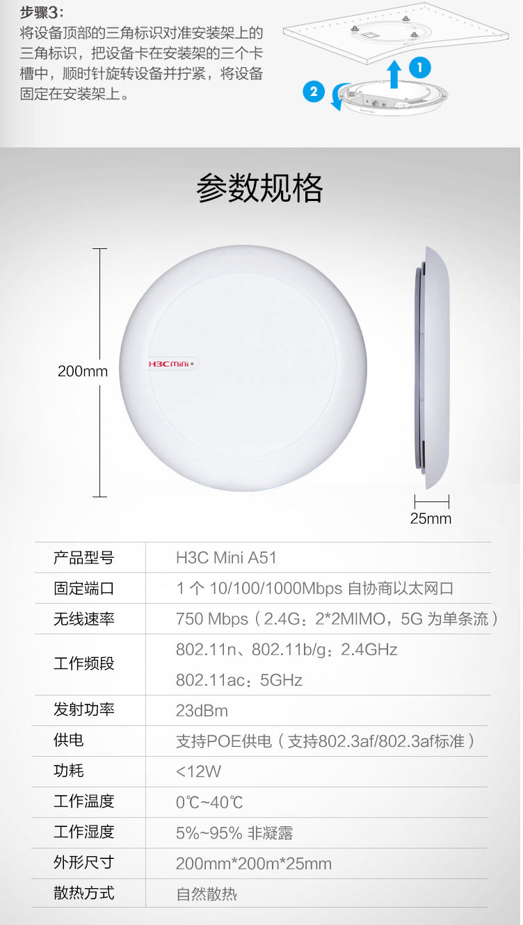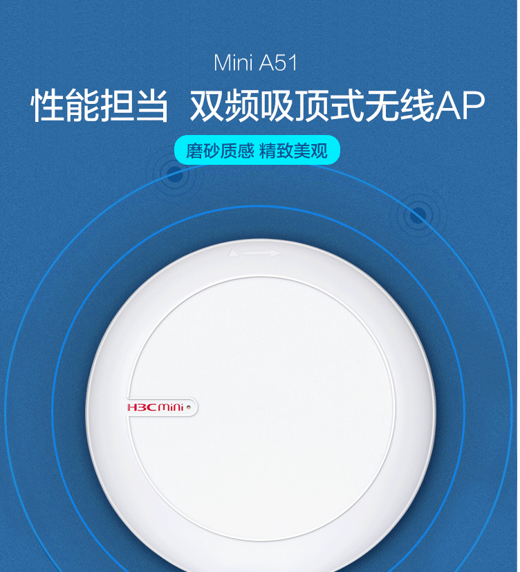 商品名称:华三(H3C)750M 5G双频无线吸顶AP 企业级wifi接入 POE供电 Mini A51