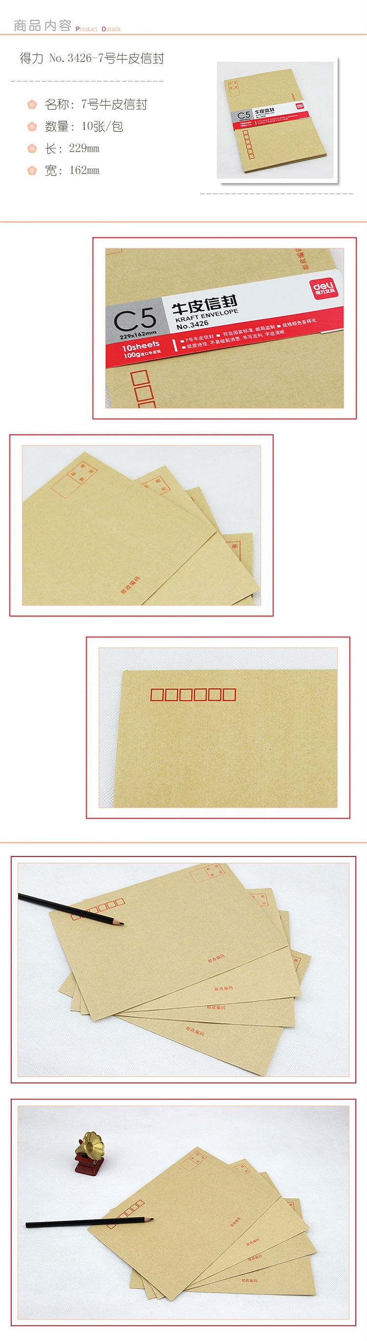 商品名称:得力(deli) 7号牛皮纸信封 229*162mm标准信封 3426(10张/包)