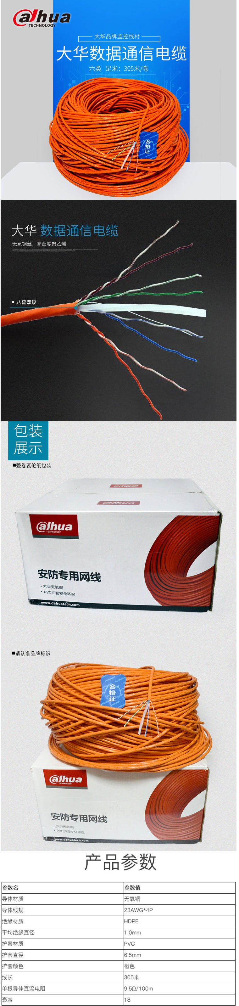 商品名称:大华(dahua)六类监控网线 整箱305米 DH-PFM920I-6U