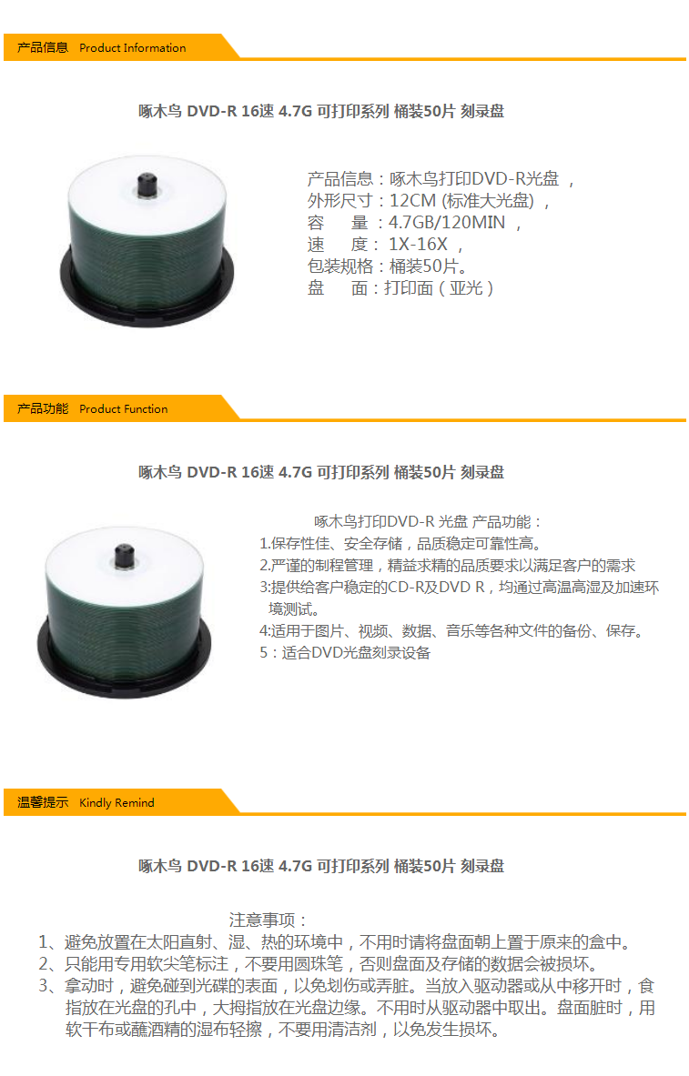商品名称:啄木鸟 DVD-R 可打印光盘 4.7G光盘/刻录光盘/空白光盘 50片/盒