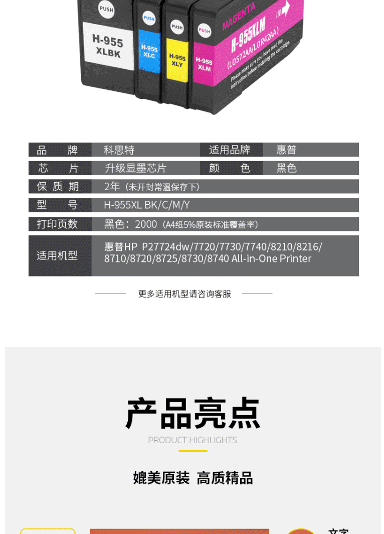 商品名称:科思特(KST)墨盒 955XL Y 黄色大容量墨盒 (适用惠普HP P27724dw/7720 7730 7740 8210 8216 8710)