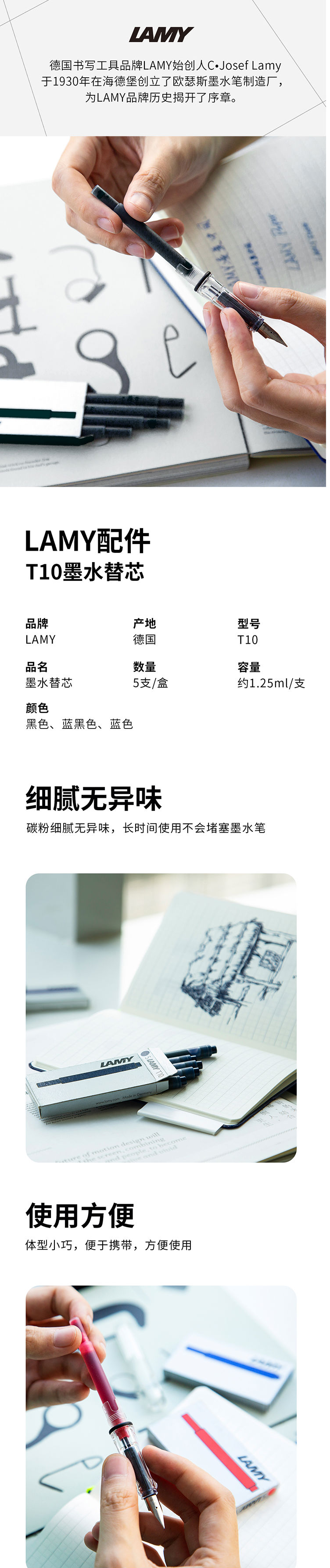 商品名称:凌美(LAMY)钢笔签字笔笔芯 墨胆 墨囊 墨水芯 T10黑色(5支/盒)