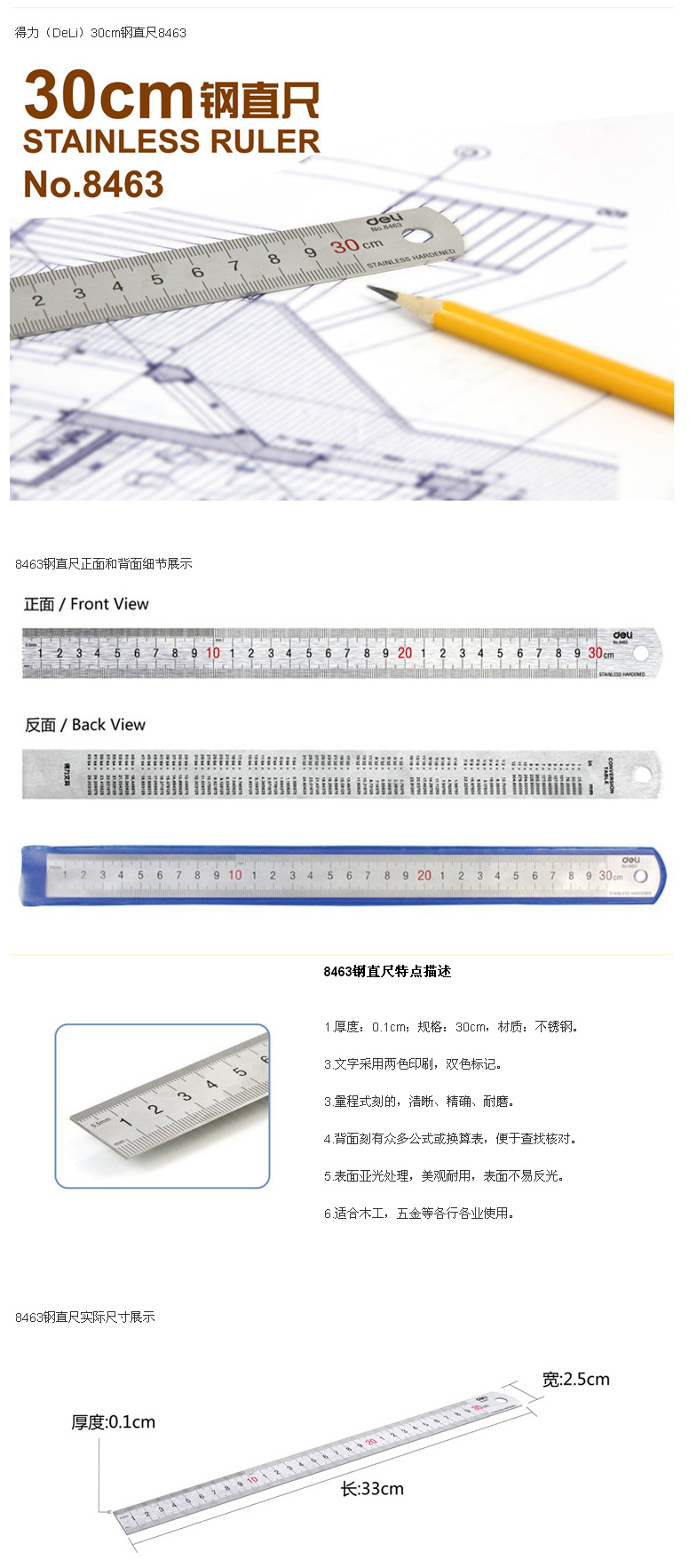 商品名称:得力(deli)8463钢尺 不锈钢尺子30cm直尺