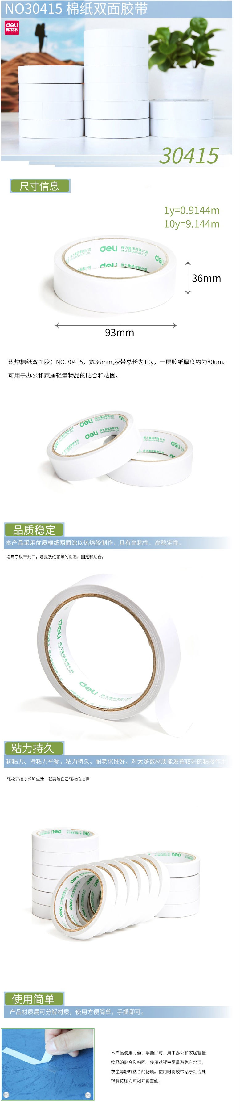 商品名称:得力(deli)两面 双面胶带 强力(36mm*10y)30415 (单位:卷)