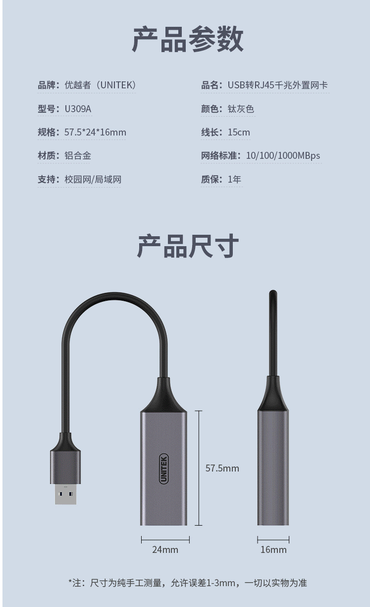 商品名称:优越者(UNITEK)usb千兆网卡 USB转网口 RJ45网线接口U309A