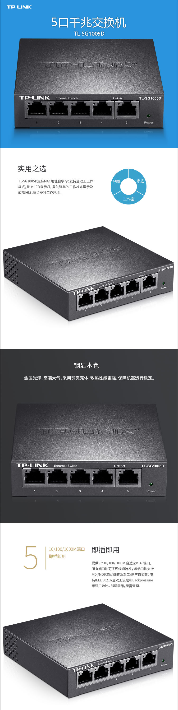 商品名称:TP-LINK 5口千兆交换机TL-SG1005D 企业级交换器 金属机身