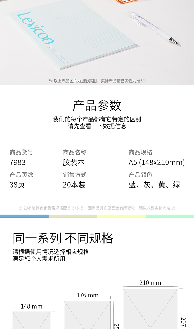 商品名称:得力7983办公胶装本(混)-38张-A5 20本/包
