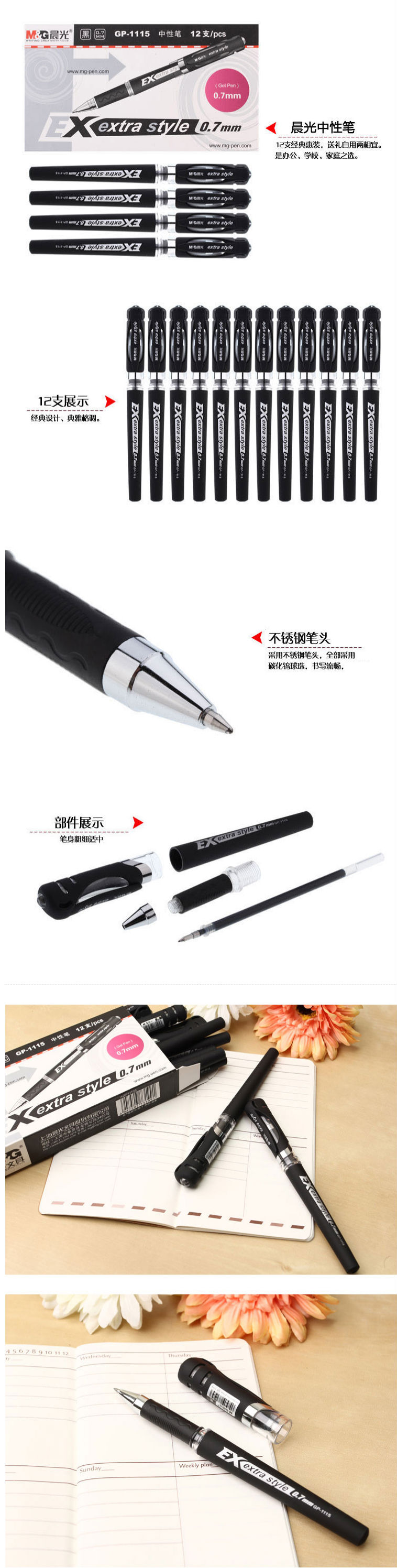 商品名称:晨光(M&G) 0.7mm黑色中性笔 经典子弹头签字笔 GP1115黑色 12支/盒
