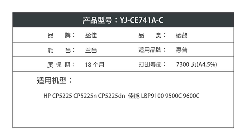 商品名称:盈佳YJ CE741A(307A)兰鼓(带芯片) 适用于:HP CP5225 CP5225n CP5225dn 佳能LBP9100 9500C 9600C