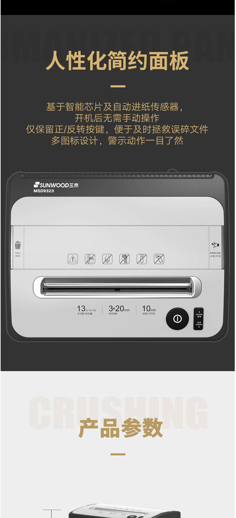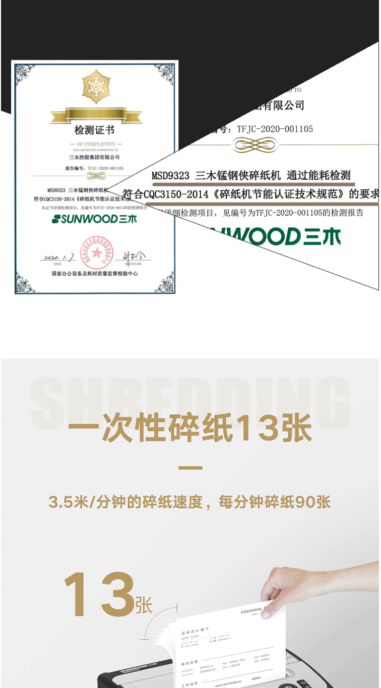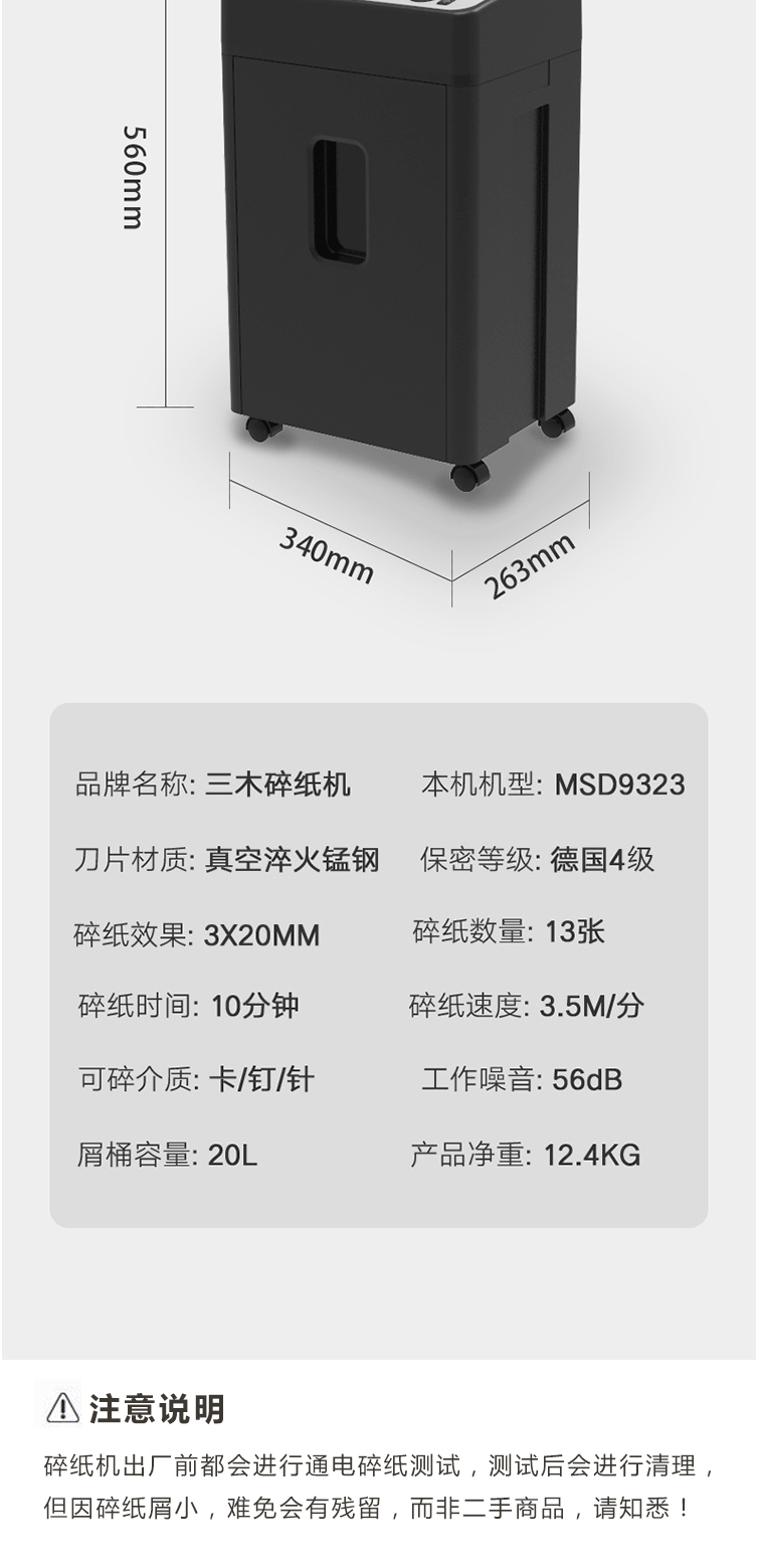 商品名称:三木(SUNWOOD)4级保密办公商用碎纸机MSD9323 (单次13张 持续10分钟 20L 可碎纸,卡,回形针、订书针)