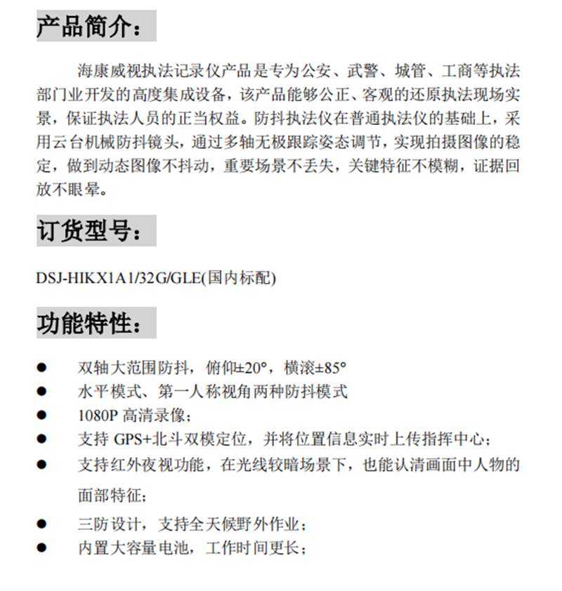 商品名称:海康威视 执法记录仪 DSJ-HIKX1A1/32G/GLE(国内标配)
