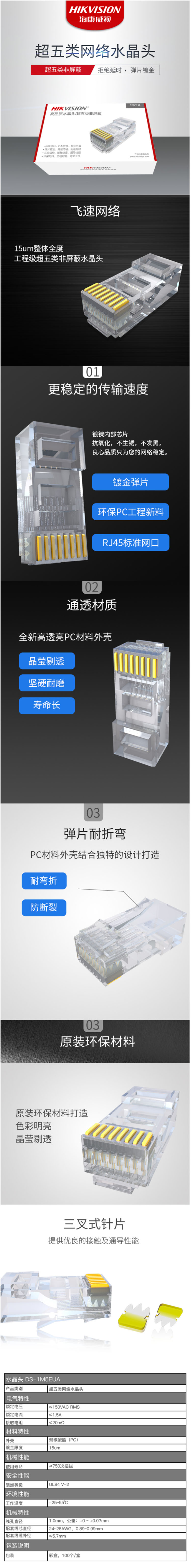 商品名称:海康威视 网线水晶头 DS-1M5EUA 超五类非屏蔽水晶头 100个/盒