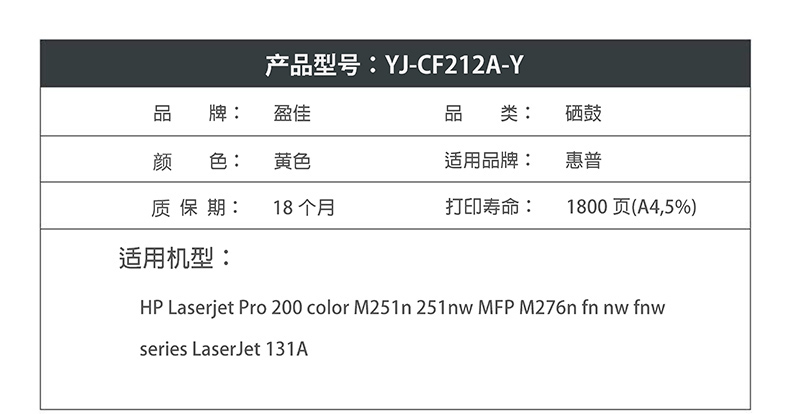 商品名称:盈佳YJ CF212A(131A)黄鼓(带芯片) 适用于:HP Laserjet Pro 200 color M251n 251nw MFP M276n fn nw fnw series LaserJet 131A