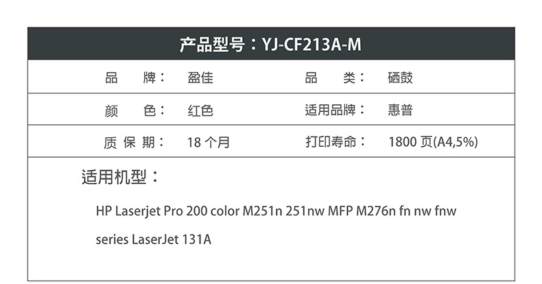 商品名称:盈佳YJ CF213A(131A)红鼓(带芯片) 适用于:HP Laserjet Pro 200 color M251n 251nw MFP M276n fn nw fnw series LaserJet 131A