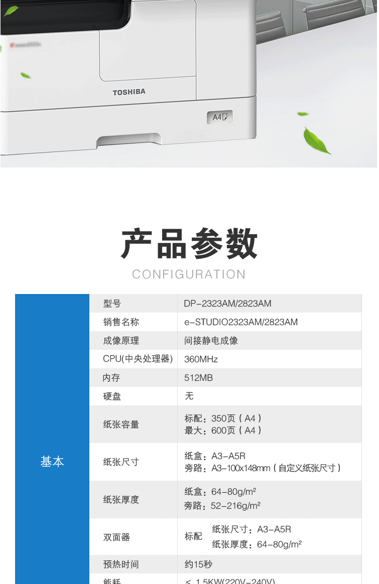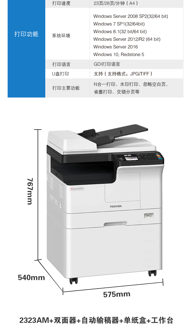 商品名称:东芝(TOSHIBA)DP-2323AM 数码复合机 A3双面打印复印扫描e-STUDIO2323AM+双面器+自动输稿器+单纸盒+工作台
